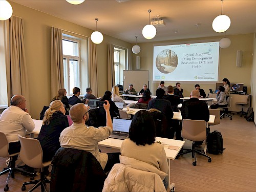 The workshop was structured in two main parts. First, we were honoured to host a panel discussion on “Doing Development Research Within and Beyond Academia” with Heini Vihemäki (Funding Advisor, LUT University), Axel Sointu (Manager, Partnerships at Finnpartnership), Nea‑Mari Heinonen (Lead Evaluation Specialist and Deputy Director, Development Evaluation Unit, Ministry for Foreign Affairs of Finland), Maaria Seppänen (Consultant in Development Cooperation Evaluation), Outi Hakkarainen (Policy Adviser for Global Justice at Fingo), and Joni Valkila (Director, Uskontojen Uhrien Tuki – Support for Victims of Religion). The discussion was facilitated by Judith Kahamba (Postdoctoral Researcher in Development Studies).
